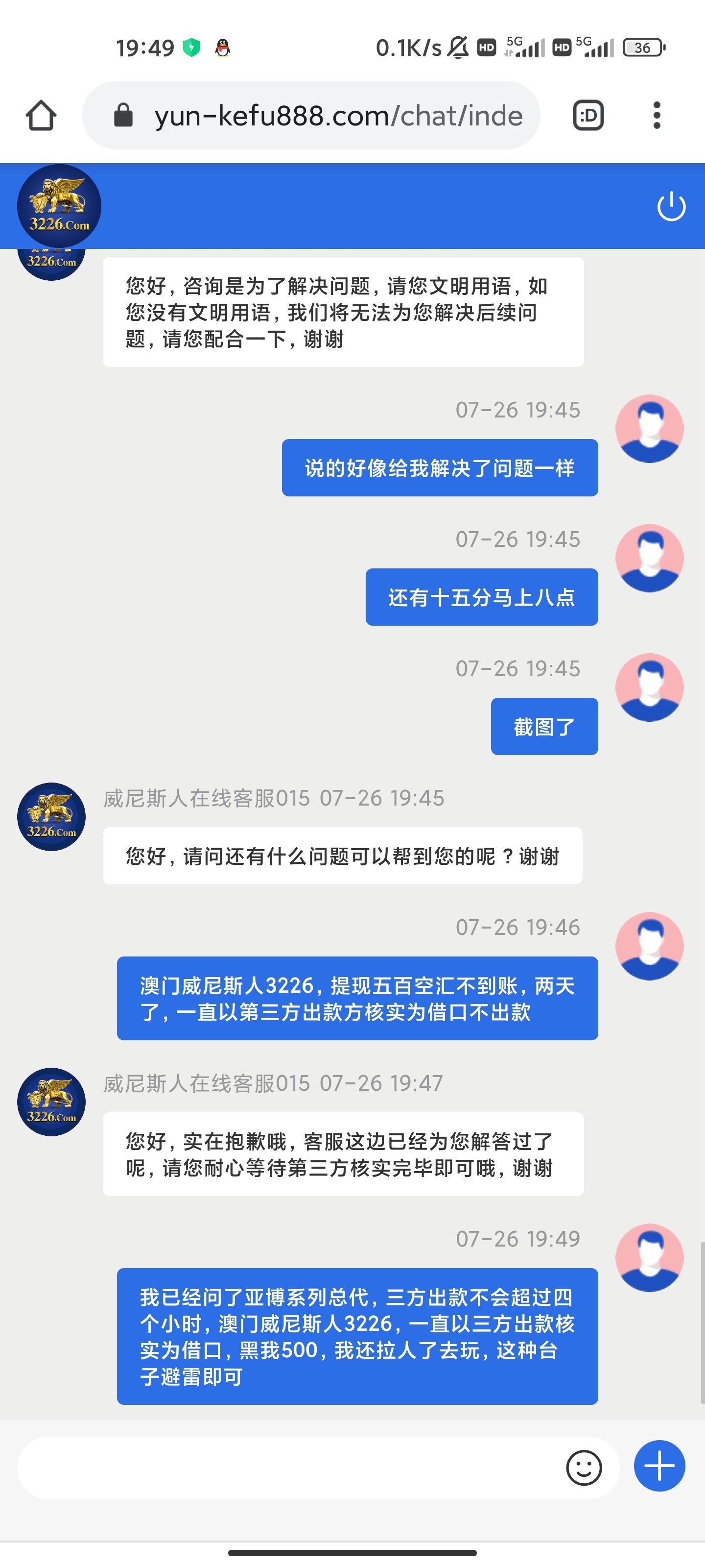三分出款都是在四小时内出款,超过就会退回,澳门威尼斯人3226,两天了黑我五百不到账,一直以三方出款核实为借口,黑我500,各位老哥避雷,充值必死