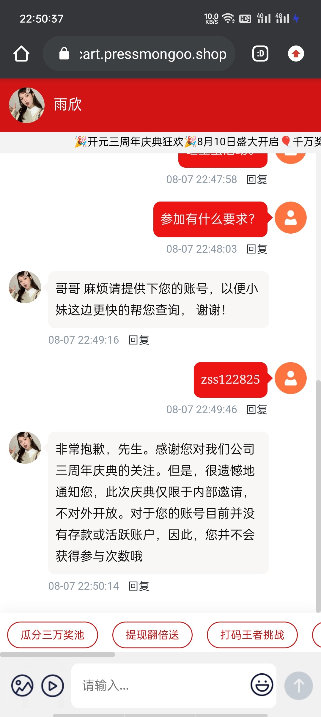 老用户必得不过抽奖次数有延迟,新用户注册绑卡自测能不能参加反正前两天是能的。周年庆活动很多,每天登录砸金蛋最少三次还有签到,打码活动,我还中了个Zippo打火机,我是老用户,撸的五百多出了