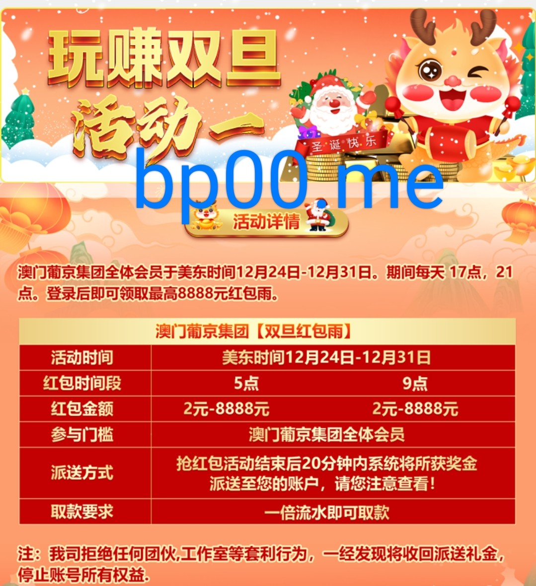 新老用户注册登陆 12月24日~12月31日 每天下午5点和晚上9点登陆即可抢红包 金额随机 无游戏限制 最低提款100元