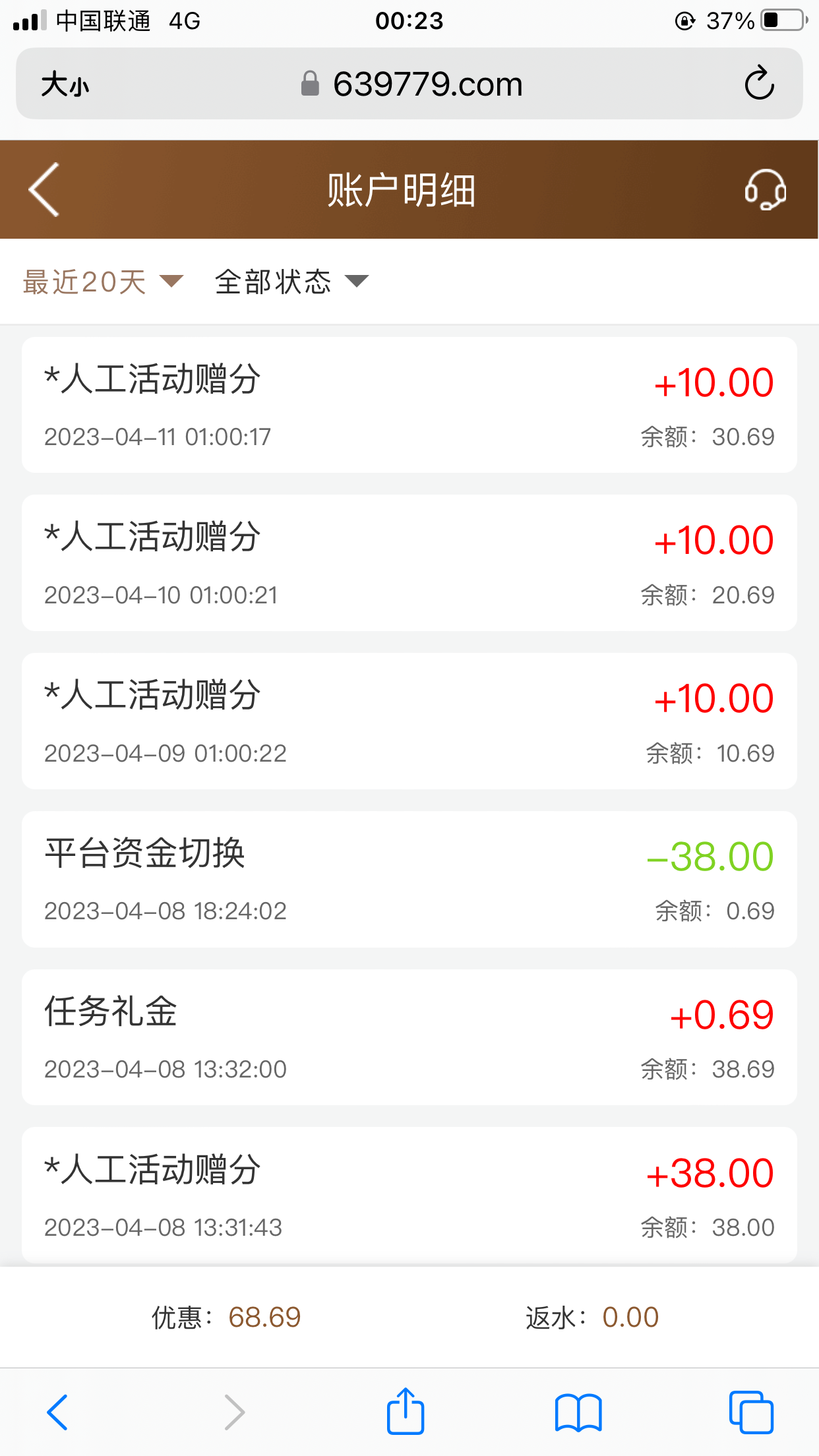 前天电话特邀送当天38,后面三天送10,昨天提了200,今天用送的10赢了600提现被冻结,客服说充等值的金额一倍流水就能提。看帖子说这个平台稳,充了600,提了1900