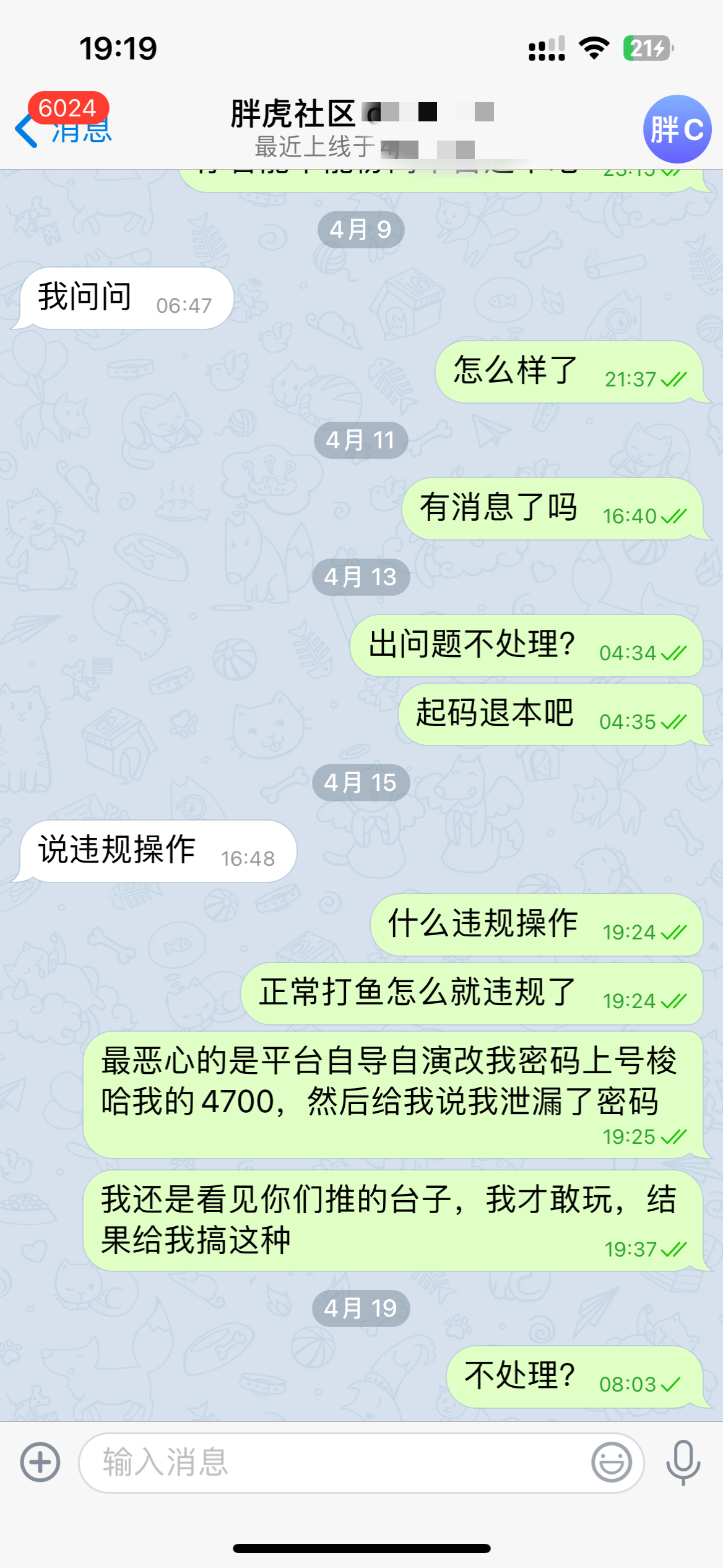 在蜘蛛社区走的胖虎链接,清明节左右打的五龙捕鱼,提现半天不到帐,被平台自导自演改密码上号梭哈余额,原本还以为是平台搞的,看了另一个帖子的凯亚娱乐城被黑的评论,感觉是胖虎上级去平台那改我密码然后上我号梭哈了,因为我赢了相当于把他的亏损给吃了