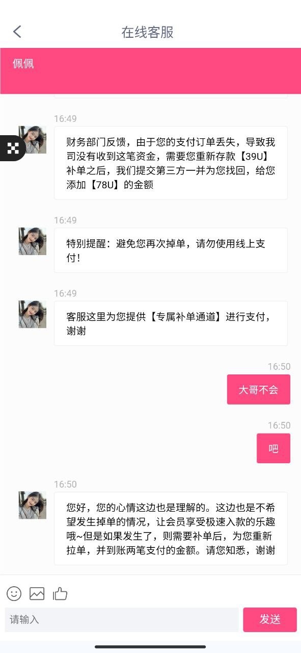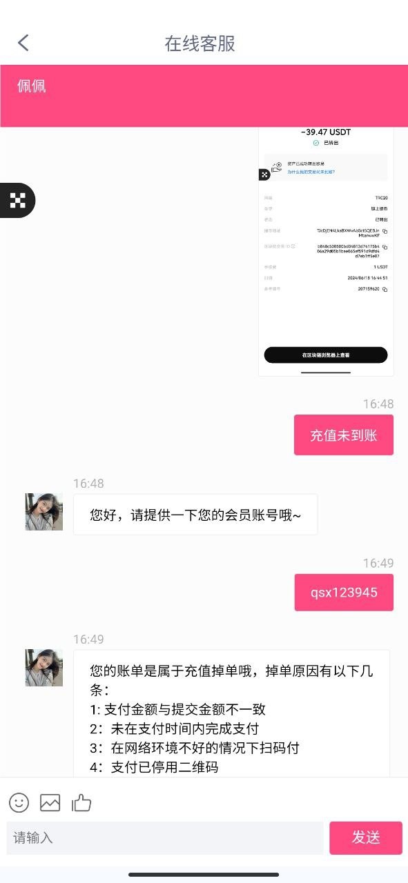 这平台我都VIP2累充不下1万了,用U充值300不到账,找客服给的理由是“掉单”! 用U充值还有掉单的吗,查链都看到地址收到钱了,还让我再冲一笔,两笔一起到账!!!