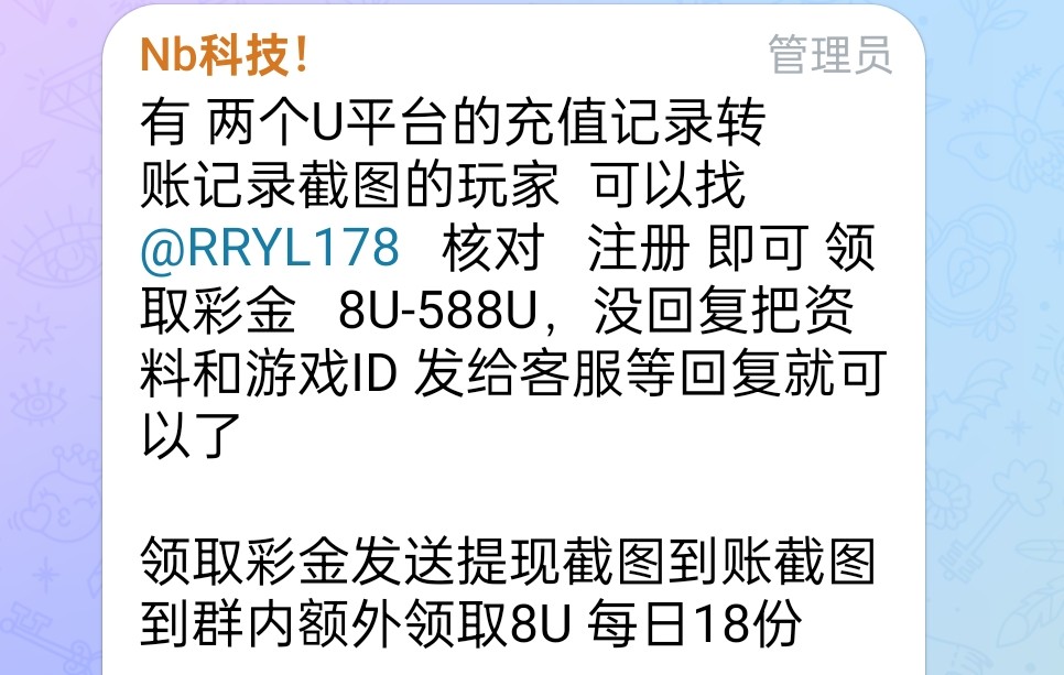 有两个u平台的充值记录转账记录截图的玩家  可以找 飞机客服:@RRYL178   核对  注册 即可 领取彩金   8U-588U,没回复把资料和游戏ID 发给客服等回复就行