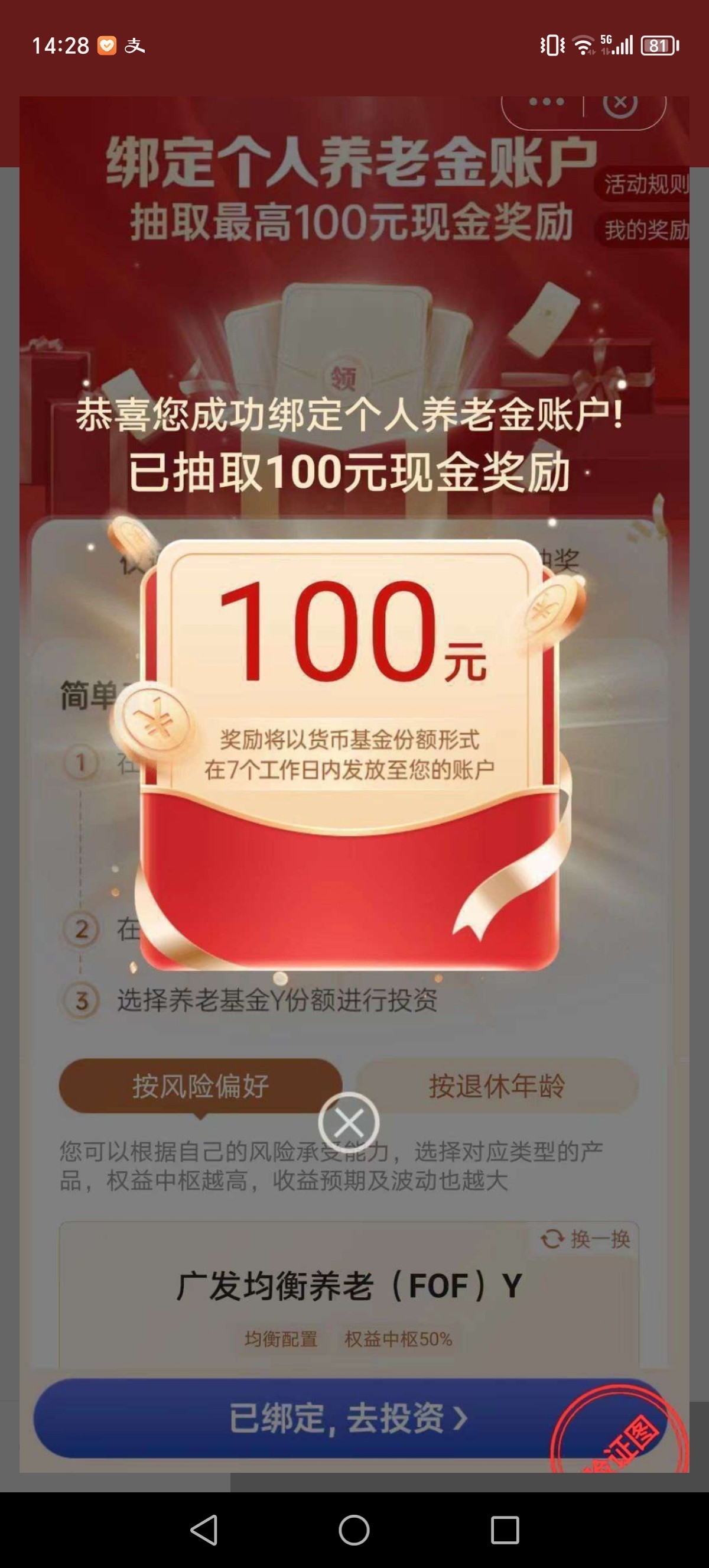需要有养老金账户,绑定抽奖必得30-100.窝抽到了100