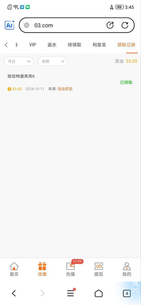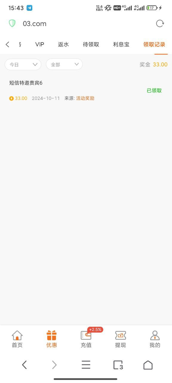 下载app注册完善信息,优惠活动里面找到活动输入手机号自助领取33彩金,注意必须要下载app注册,不是特邀用户的还有一个下载app彩金。