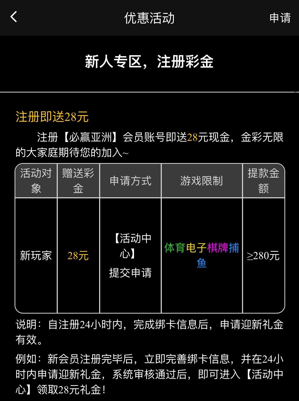 注册完善绑卡信息,下载APP优惠里申请,28彩金盈利到280/16彩金盈利到160限钱能取款,限体育电子棋牌捕鱼