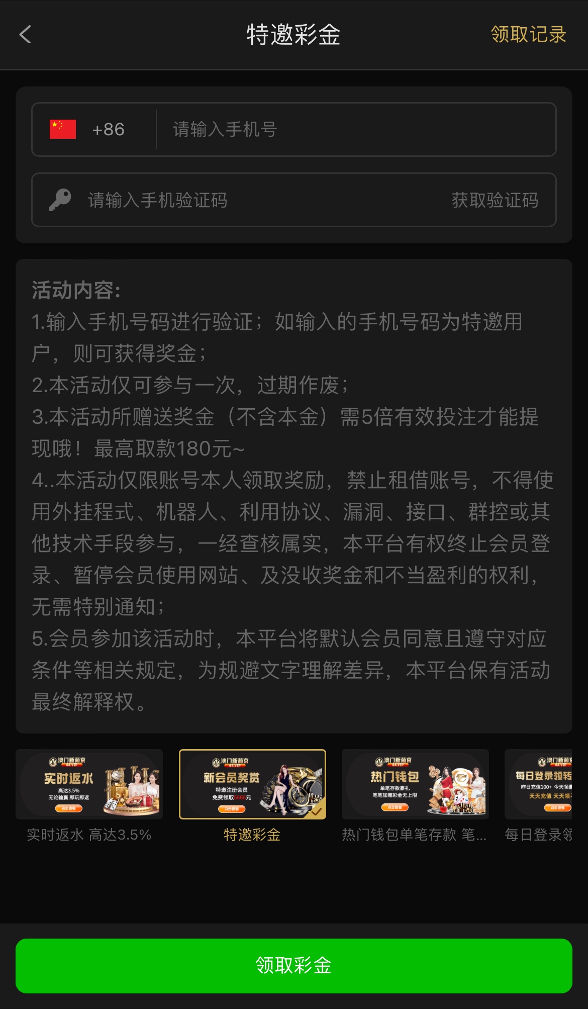 特邀碰瓷具体送多少自测因为我不是特邀所以不清楚,自己去碰瓷吧,彩金5倍流水,最高取款180