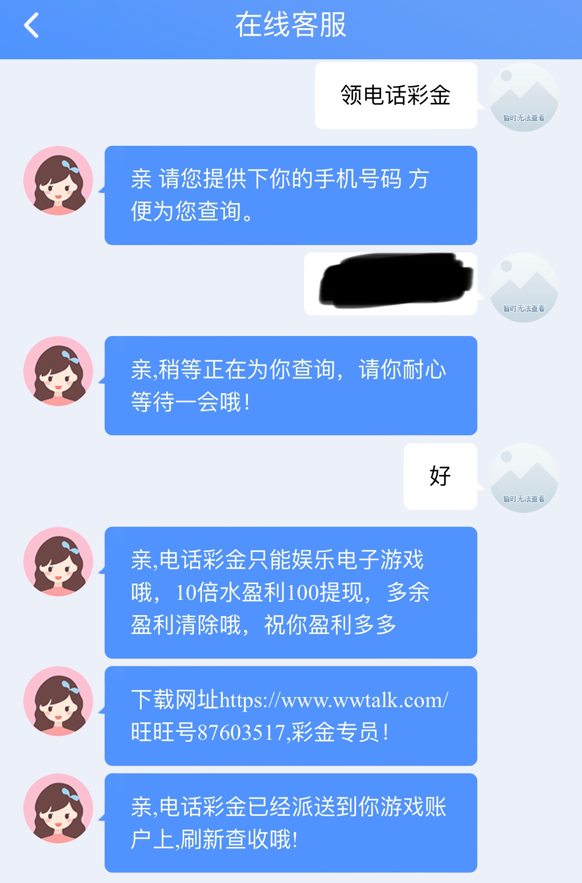 碰瓷电话彩金,之前有注册娱乐过的兄弟可以去试试,联系在线客服说领取电话彩金发手机号给他查,在名单会送的,彩金10倍流水,只能提现100