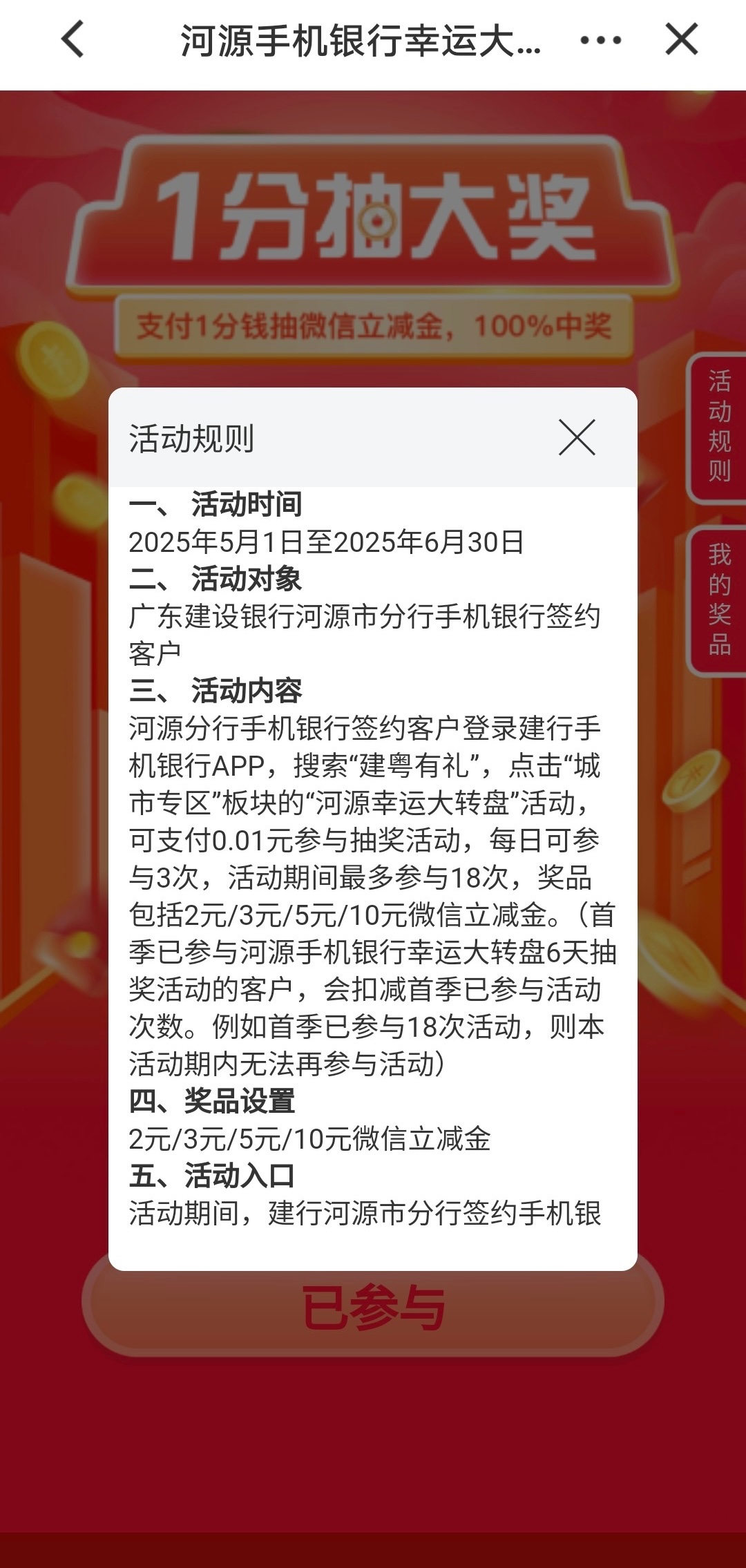 可能跟地区有关,可以抽18次,每天3次,必中的。首页见粤有礼,找到城市专区,客户专享礼,活动看图