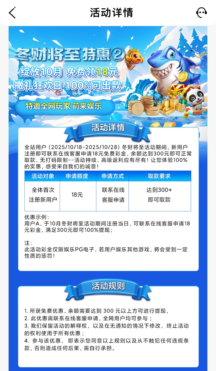 10月18号-10月28号活动期间内注册才送,没玩过这个平台的兄弟可以去注册联系客服申请,满300提现,仅限PG电子