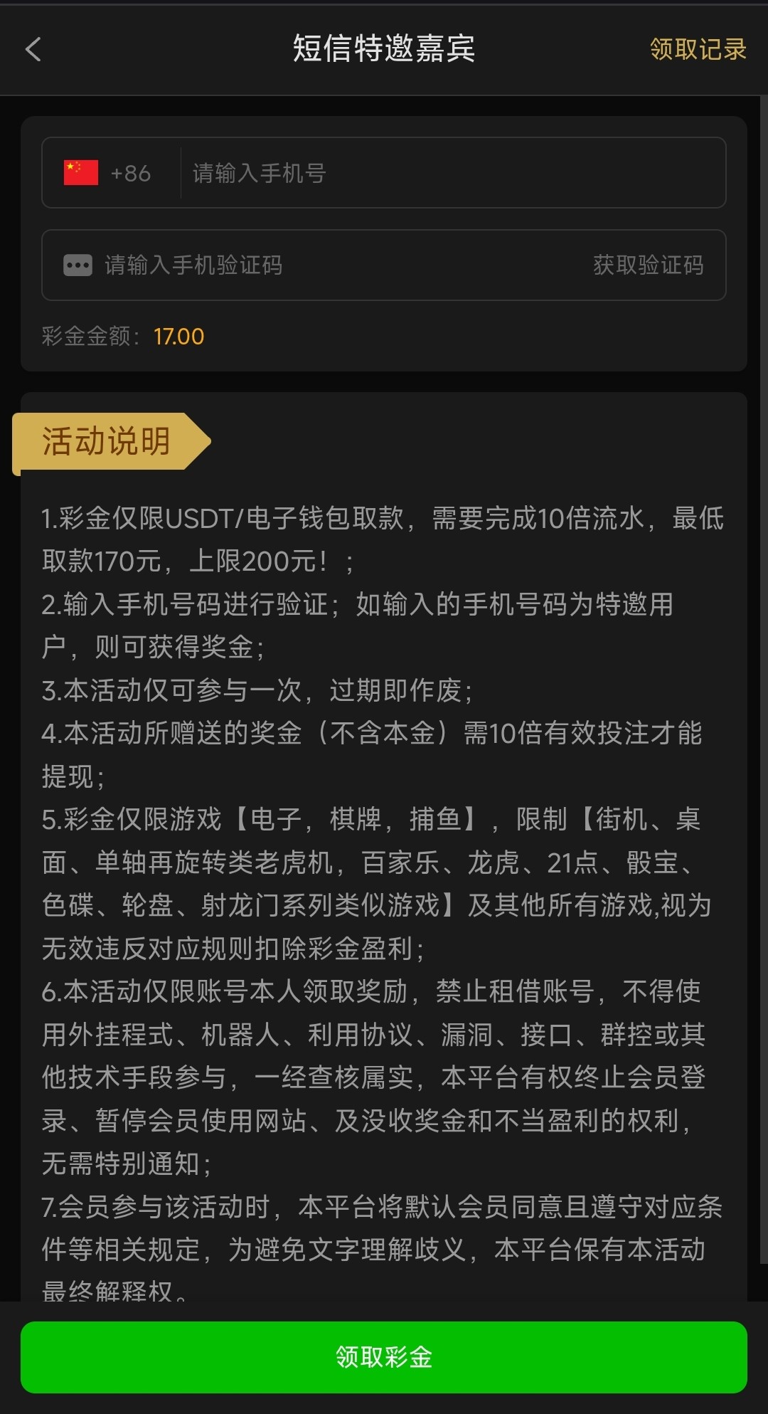没有玩过这个平台的可以去试试,注册后在优惠找的短信特邀嘉宾,填手机号获取验证码,10倍流水,最低170最高200提款,仅限USDT/电子钱包取款,仅限电子/捕鱼/棋牌