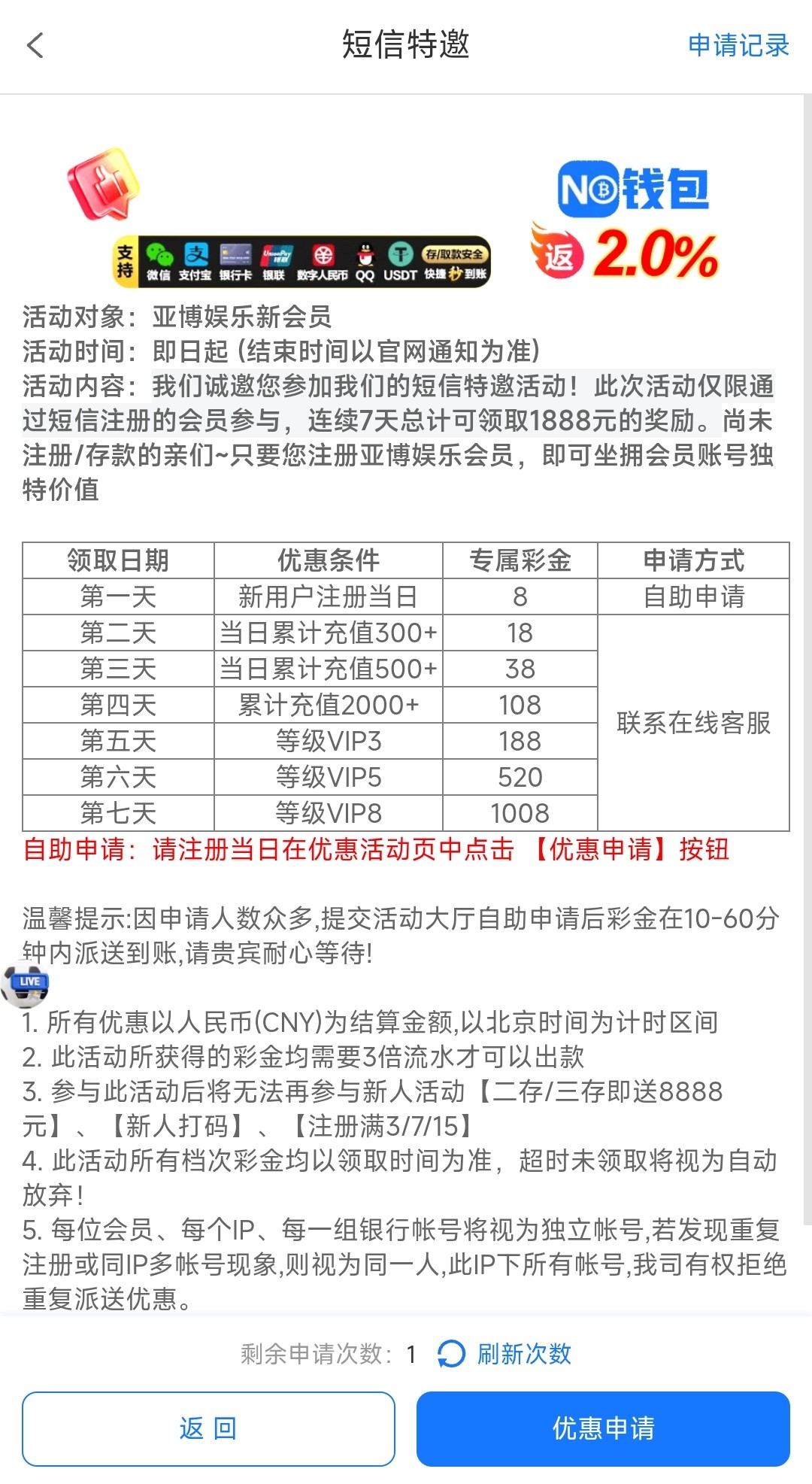 注册完善资料在优惠里申请彩金,诺拒绝了提示联系客服,联系客服会让你下载飞鸽聊天软件添加专员领取彩金,三倍流水,没说有游戏限制