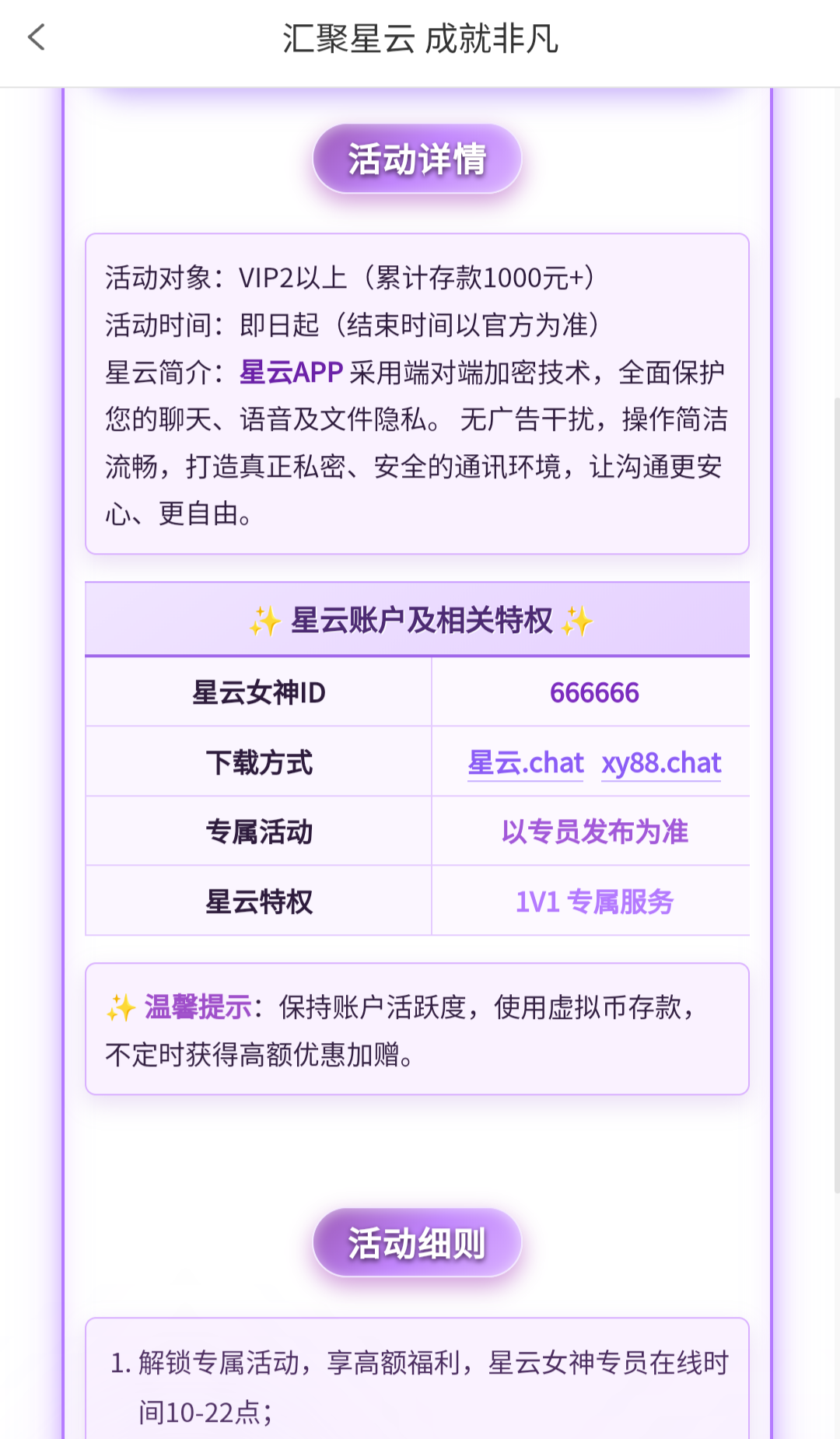 VIP2累计存款1000以上添加星云APP专员领取彩金,专员ID:666666