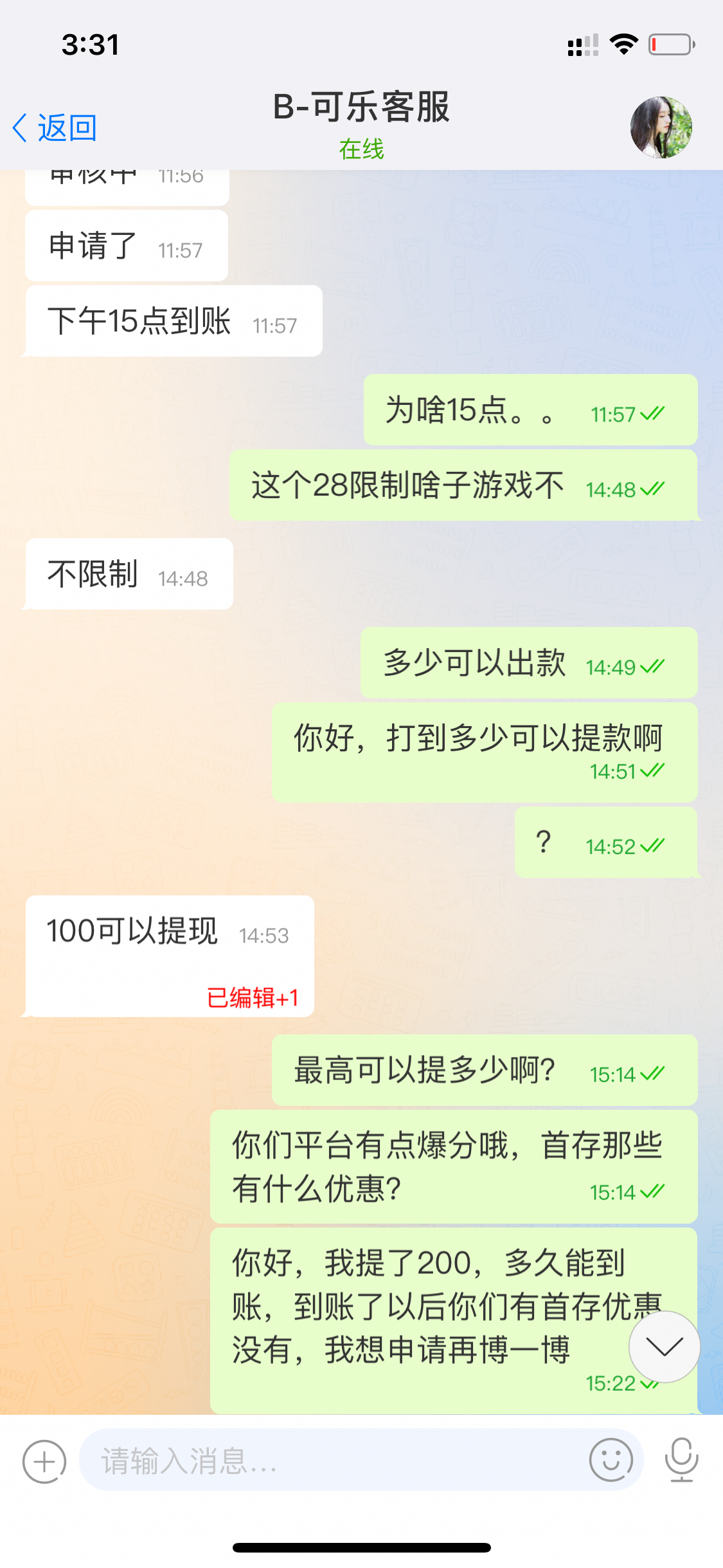 在线客服说刷抖音看到的,他会让你下个软件加彩金客服,我是送了28提款200到账,听说有点黑,也不好打,运气好压一线游戏15一首中了个150,最后是骗客服要首存,然后加急秒到。