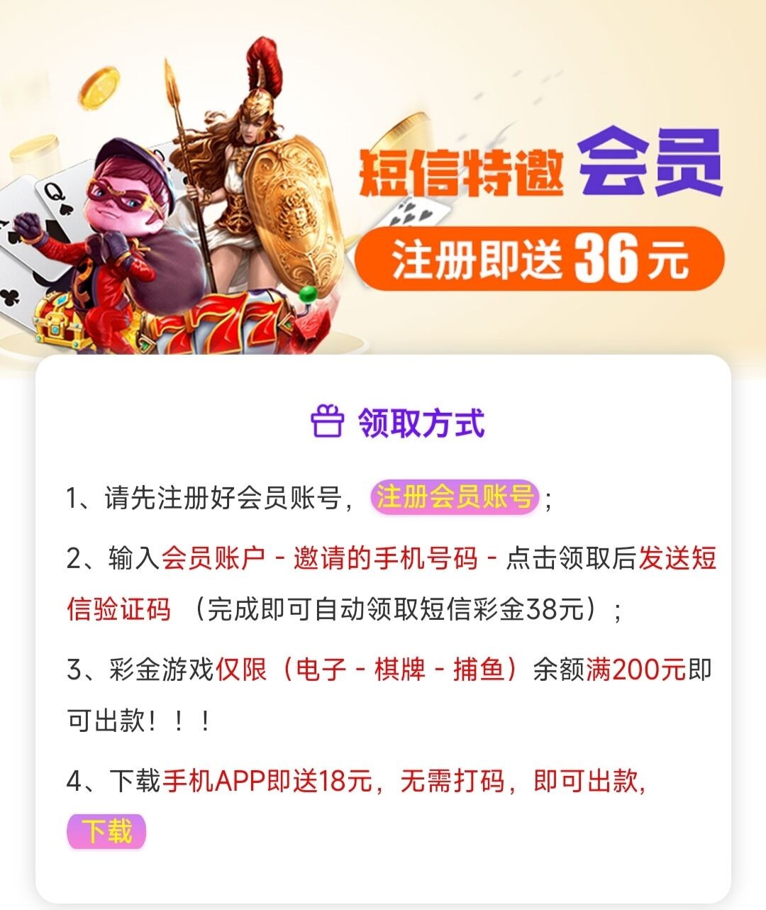 特邀碰瓷,新用户注册好去链接里申请36,限制电子/棋牌/捕鱼,最低200提现。新出的估计没多少人有,等一段时间就行了,有空就去看。