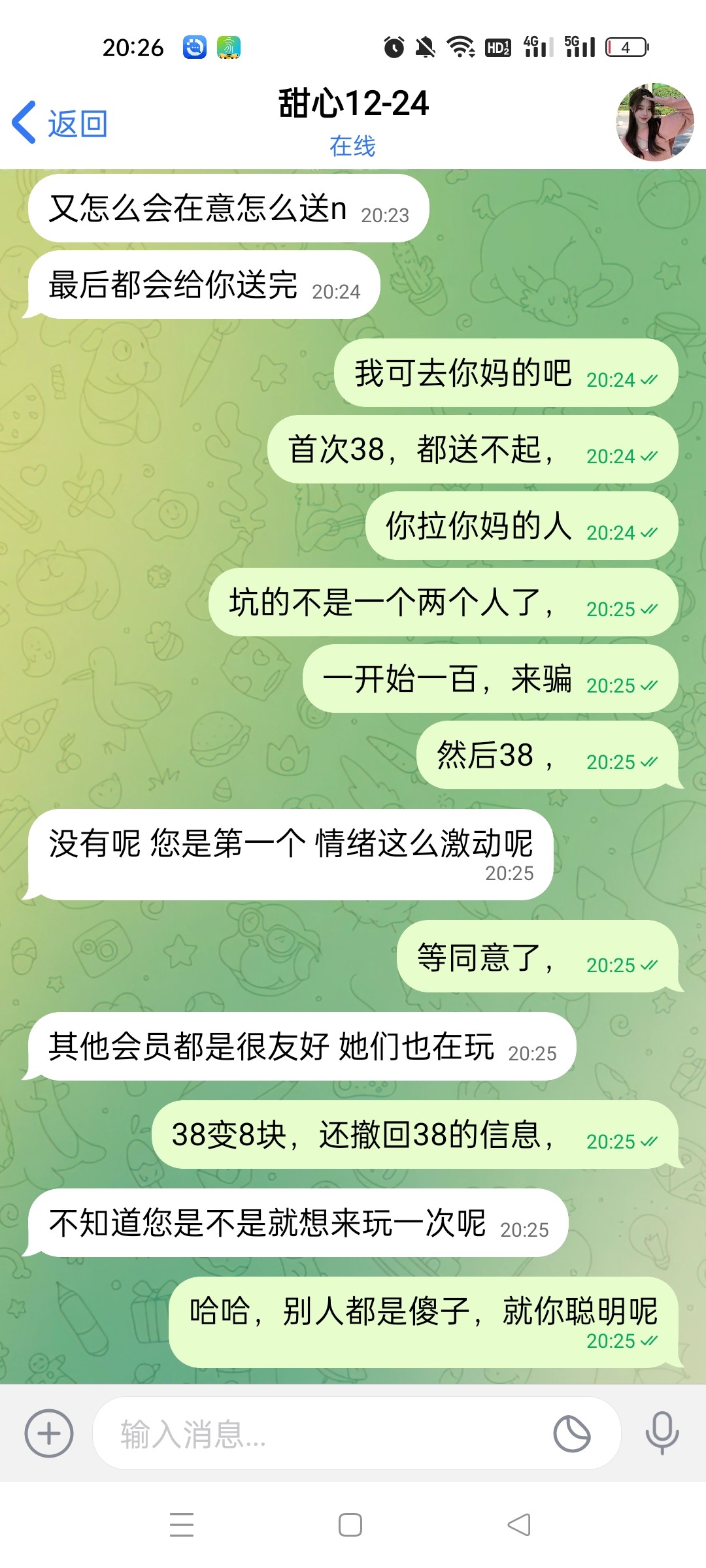 ,昨晚跟在线客服反馈,今天反馈几次都没结果昨晚就叫我继续加他,这种狗推。也是厉害,说的优惠一毛不送,还骂人,这里我他妈充了钱,就翻脸,理直气壮赖皮